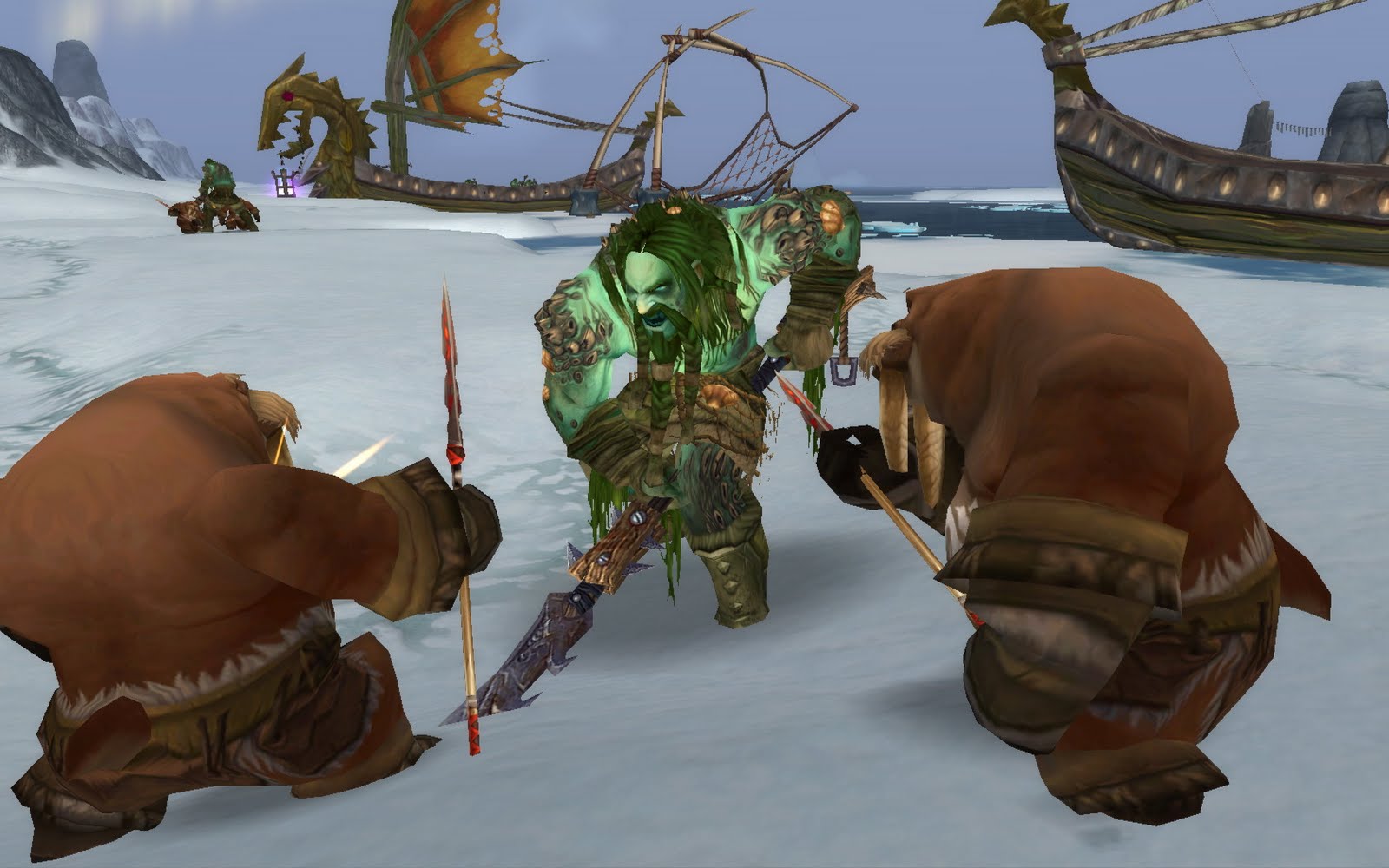 Perhaps a pyroblast was best, I thought, but I no longer had the time to prepare one. Rearing dragon heads with eyes of garnet smashed into the ice floes, a dozen kvaldir howling in bloodlust as they leapt to the shore, ancient weapons in hand. They resembled nautical mockeries of the vrykul, giant humans with skin the color of algae. Kelp strands and sea-worms thrived on their damp bodies and they stared us down through oily blue eyes, their diseased mouths slavering in anticipation.